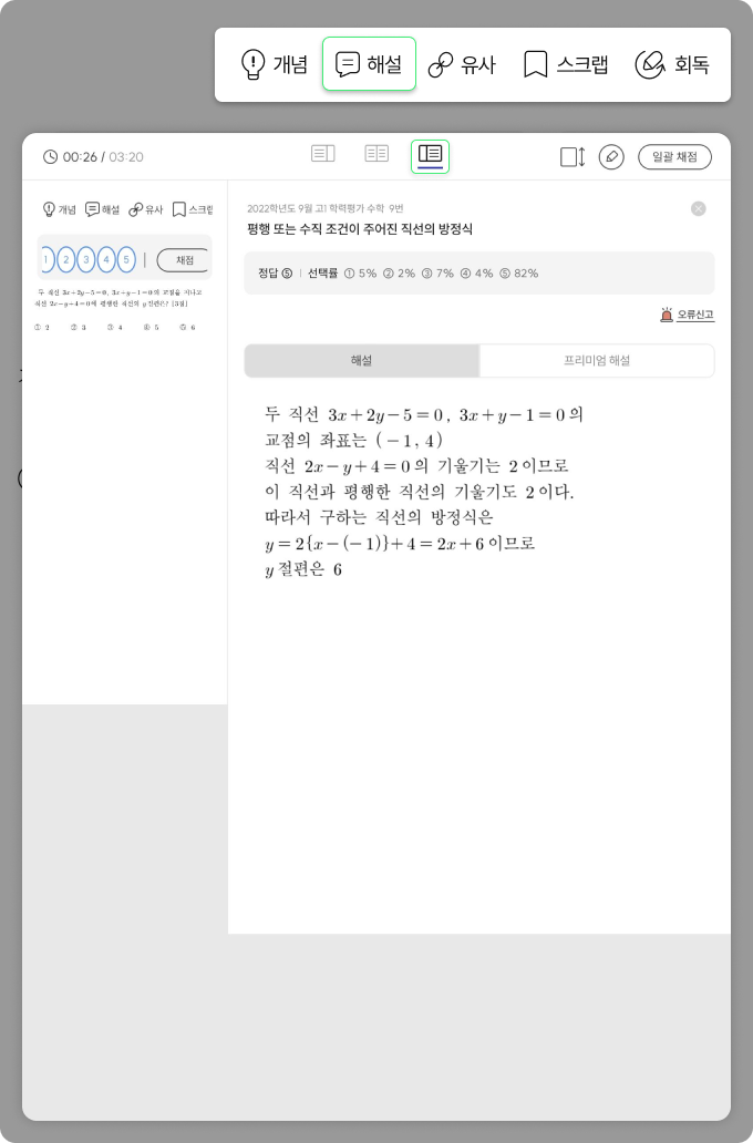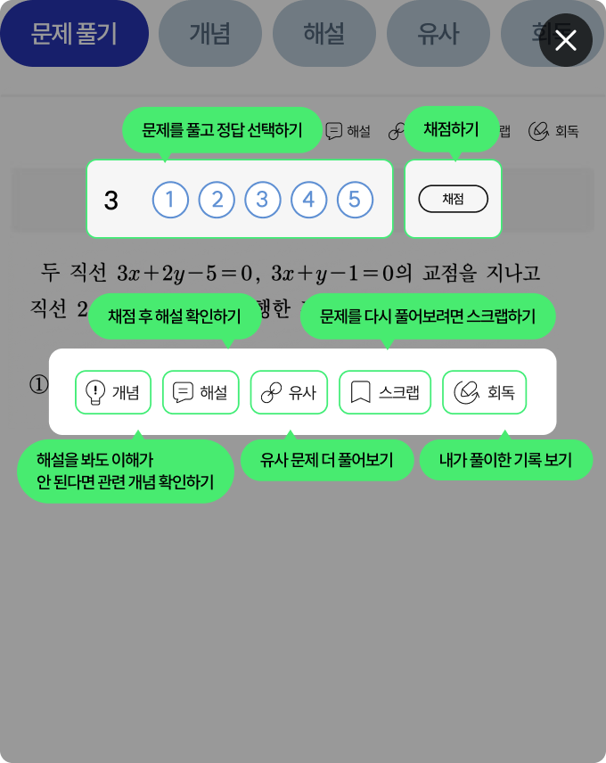 직접 문제를 풀고 채점해 보세요. 문제 화면에서 개념, 해설, 유사 문제를 바로 확인할 수 있어요.
